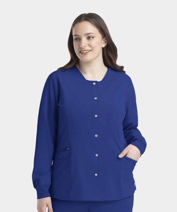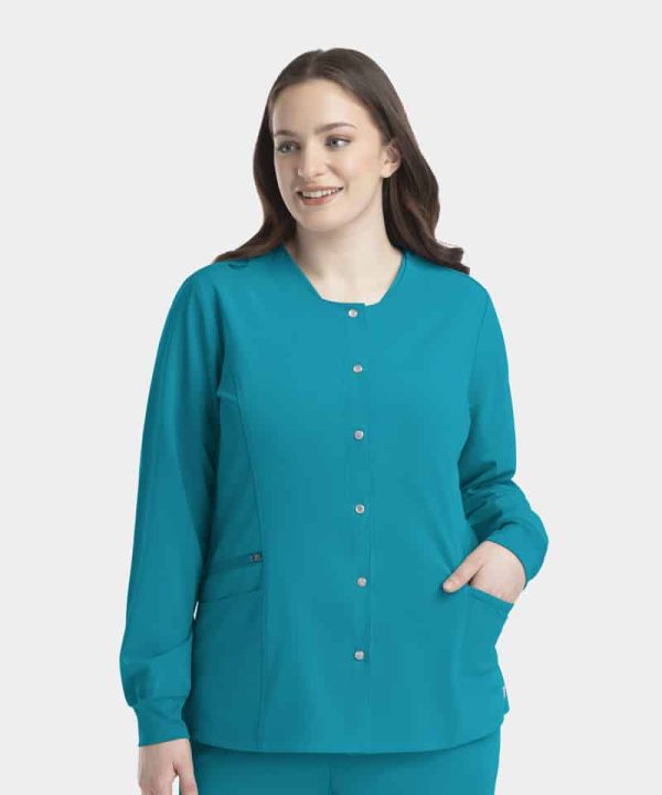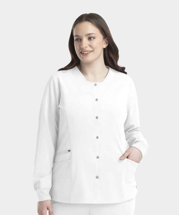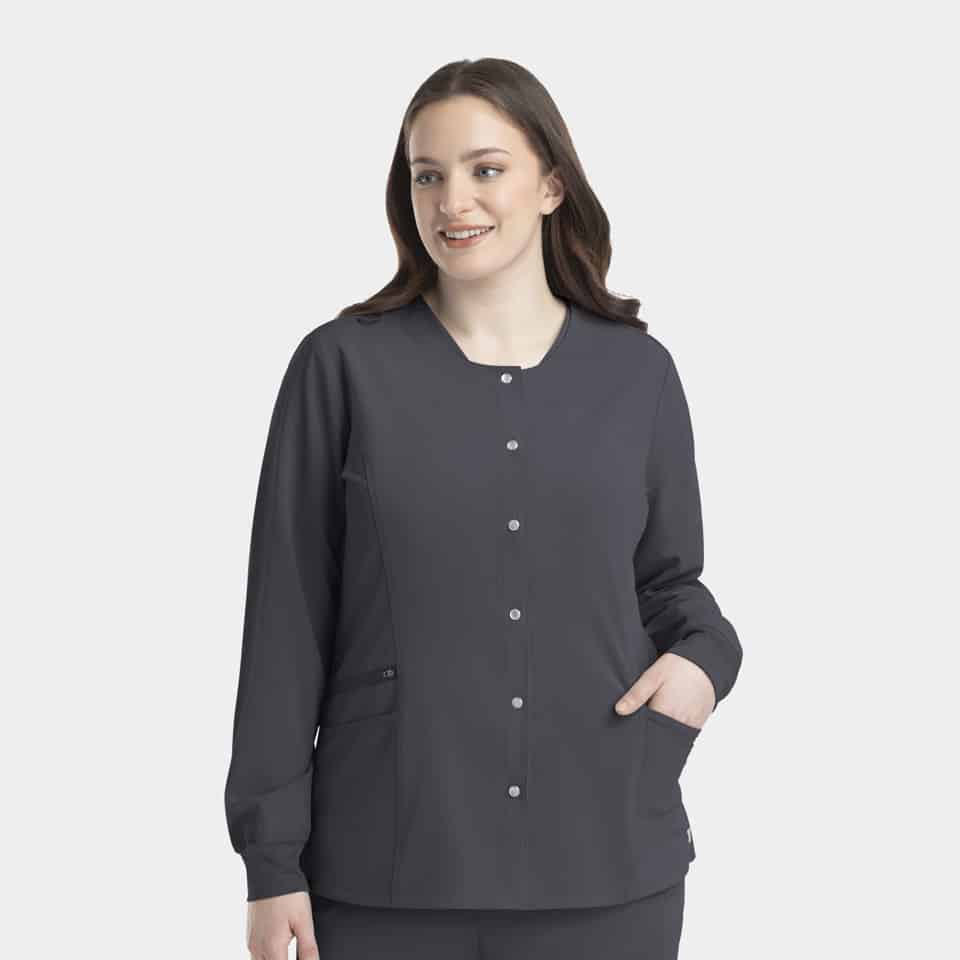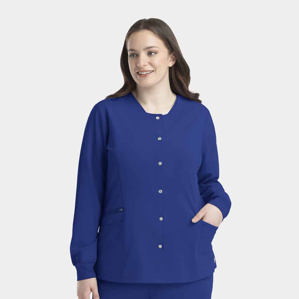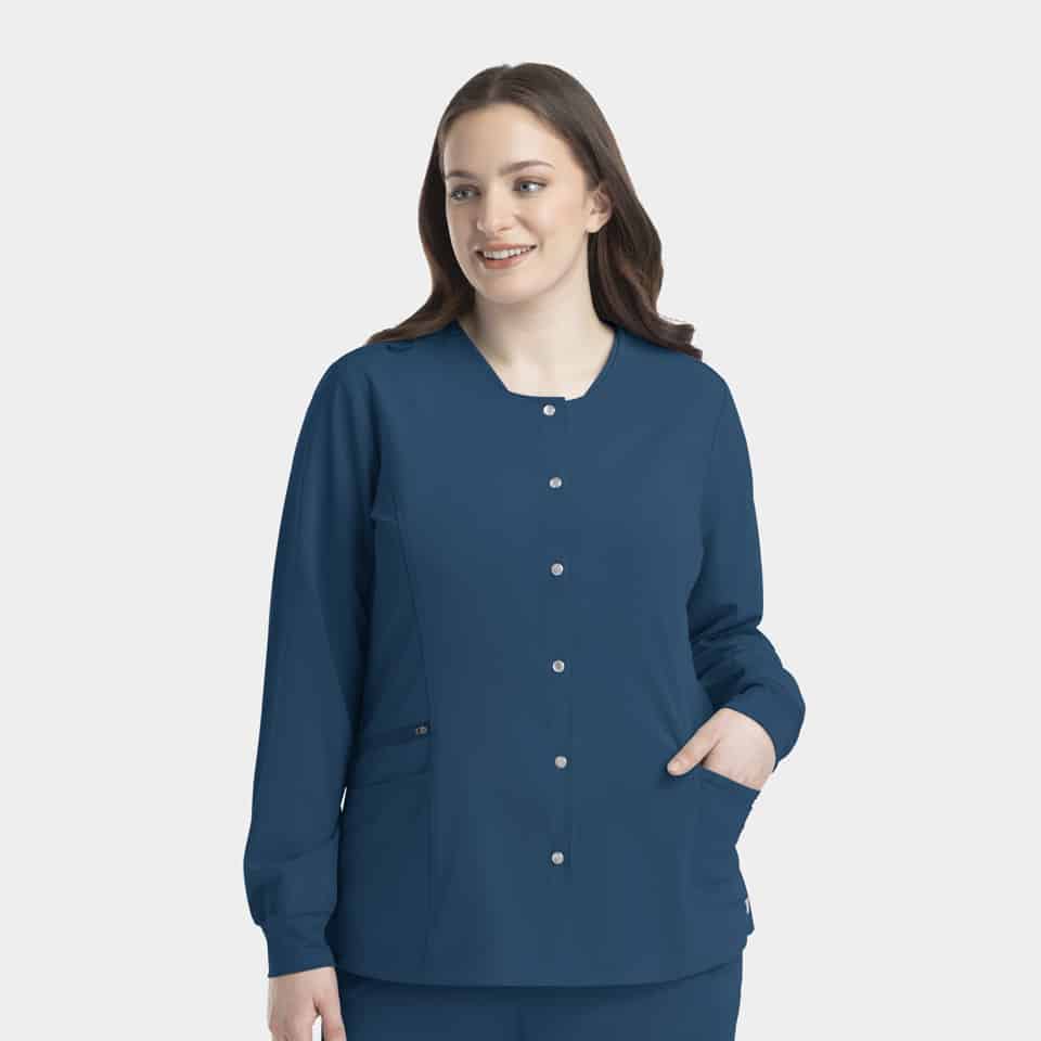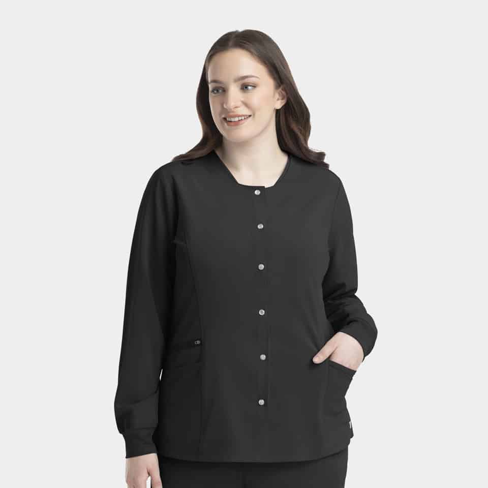 Experience the allure of our Women’s Snap Jacket. With a classic round neck, pearl snap accents, and a tailored bungee loop, it seamlessly blends style with utility. Micro-knit cuffs ensure a flawless fit, while pockets guard your essentials. Designed for the diligent healthcare warrior.