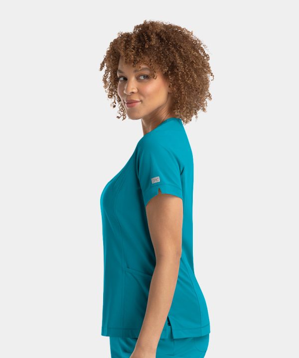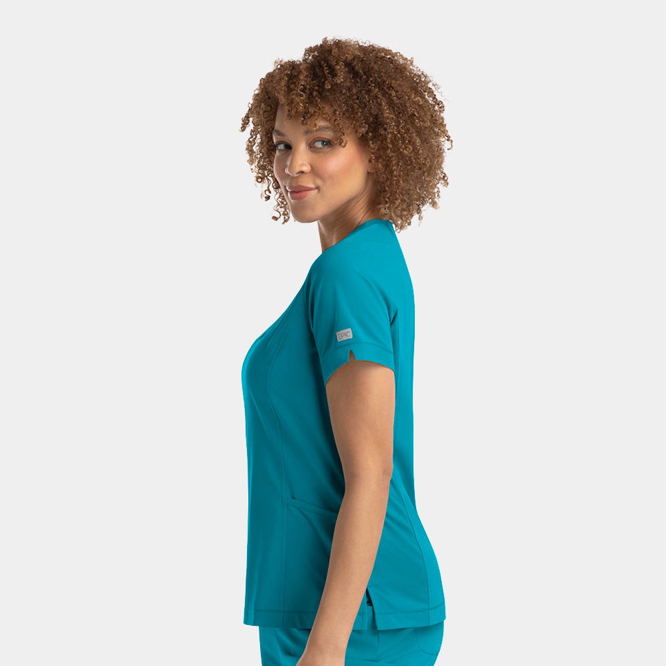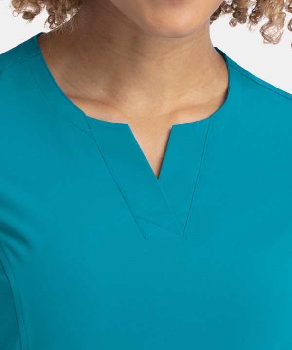 Experience unmatched comfort in our women’s structured notched neck scrub top. Tailored with a handy bungee loop, zip cell pocket for today’s healthcare warrior, and flattering princess seams. The micro knit panel ensures ease through extended shifts, while the notched neck adds a stylish touch. Perfectly blending function with fashion!
